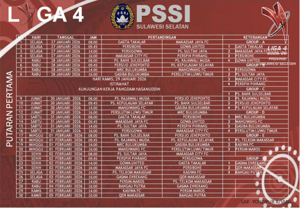 Liga 4 PSSI Sulsel 2025/2026 Resmi Bergulir, 30 Laga Tersaji di Putaran Pertama Makassar – Asosiasi Provinsi PSSI Sulawesi Selatan resmi merilis jadwal putaran pertama Liga 4 Sulsel musim 2025/2026. Kompetisi sepak bola kasta keempat nasional ini akan mulai digelar pada Selasa, 27 Januari 2026 dan berlangsung hingga Kamis, 5 Februari 2026, dengan total 30 […]