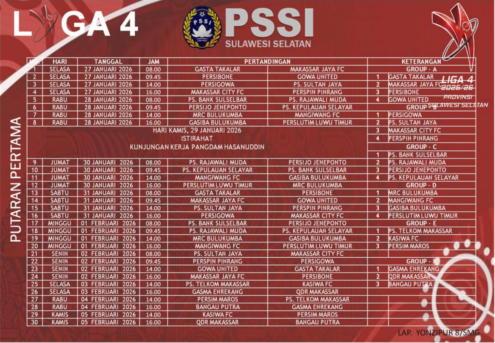 Makassar – Asosiasi Provinsi PSSI Sulawesi Selatan resmi merilis jadwal putaran pertama Liga 4 Sulsel musim 2025/2026. Kompetisi sepak bola kasta keempat nasional ini akan mulai digelar pada Selasa, 27 Januari 2026 dan berlangsung hingga Kamis, 5 Februari 2026, dengan total 30 pertandingan yang mempertemukan klub-klub dari berbagai daerah di Sulawesi Selatan.